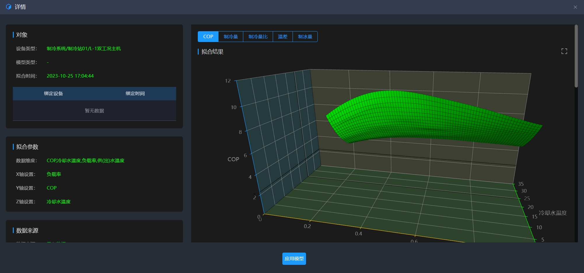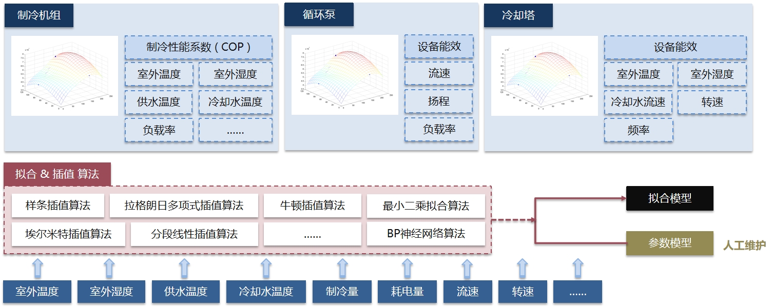 基于数据模型建模方法、机理模型建模方法和能效模型建模方法,涵盖数据模型定义、机理数学建模以及能效模型拟合。设备能效采用“白盒+黑盒”建模方法,在理论模型(数学建模)的基础上,利用现场实际运行数据对修正参数(函数)进行拟合运算,当收敛性较差或无法收敛时,可采用分段建模方法进行辅助,最终实现设备对象的精准建模,厂家出厂参数和性能指标,可用于理论模型验证和初始拟合。